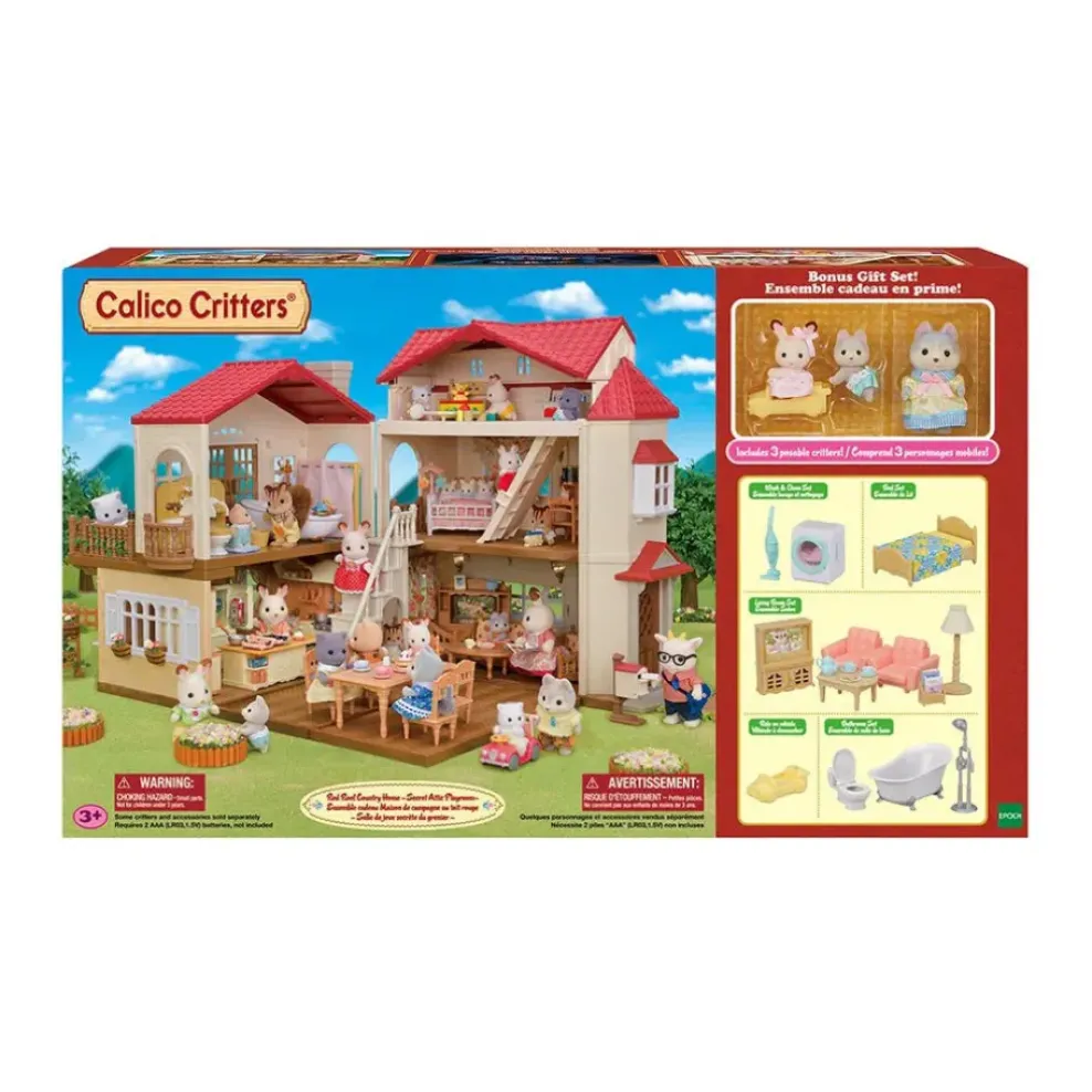 This set contains the Red Roof Country Home, furniture in original colours, and the Husky Girl, Husky Baby (crawling) and Chocolate Rabbit Baby (sitting), all in special outfits. The attic has a slide-out ladder! It is a big house that can be opened up for play and has lamps that light up. You can change the layout of the house by removing the rooms and roof. With the attic on top (a secret playroom for the babies!) the house is three storeys high. With so many types of furniture and figures, the fun never ends! Comes with a letterbox and a letter to put in it! Combine with other furniture and figures (sold separately) to act out even more stories.