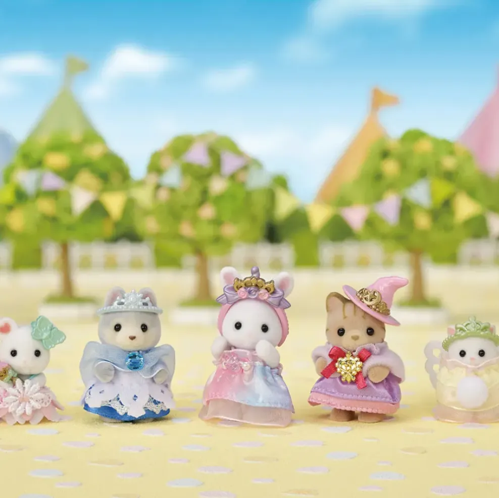 Snow Rabbit baby (Unicorn Princess), Husky baby (Snow Princess), Striped Cat baby (Magical Princess), Marshmallow Mouse cradled baby (Flower Princess), Persian Cat cradled baby (Fairy Princess), Unicorn Alice Band, Snow Tiara, Magic Hat, Fairy Tiara, Butterfly Earring, Flower Wand