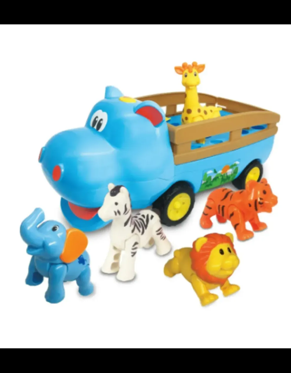 Free rolling action. Insert jungle animals for animal sounds! Button on top of truck activates engine and music sounds. Hippo mouth moves as vehicle rolls. Includes 5 safari animals.
