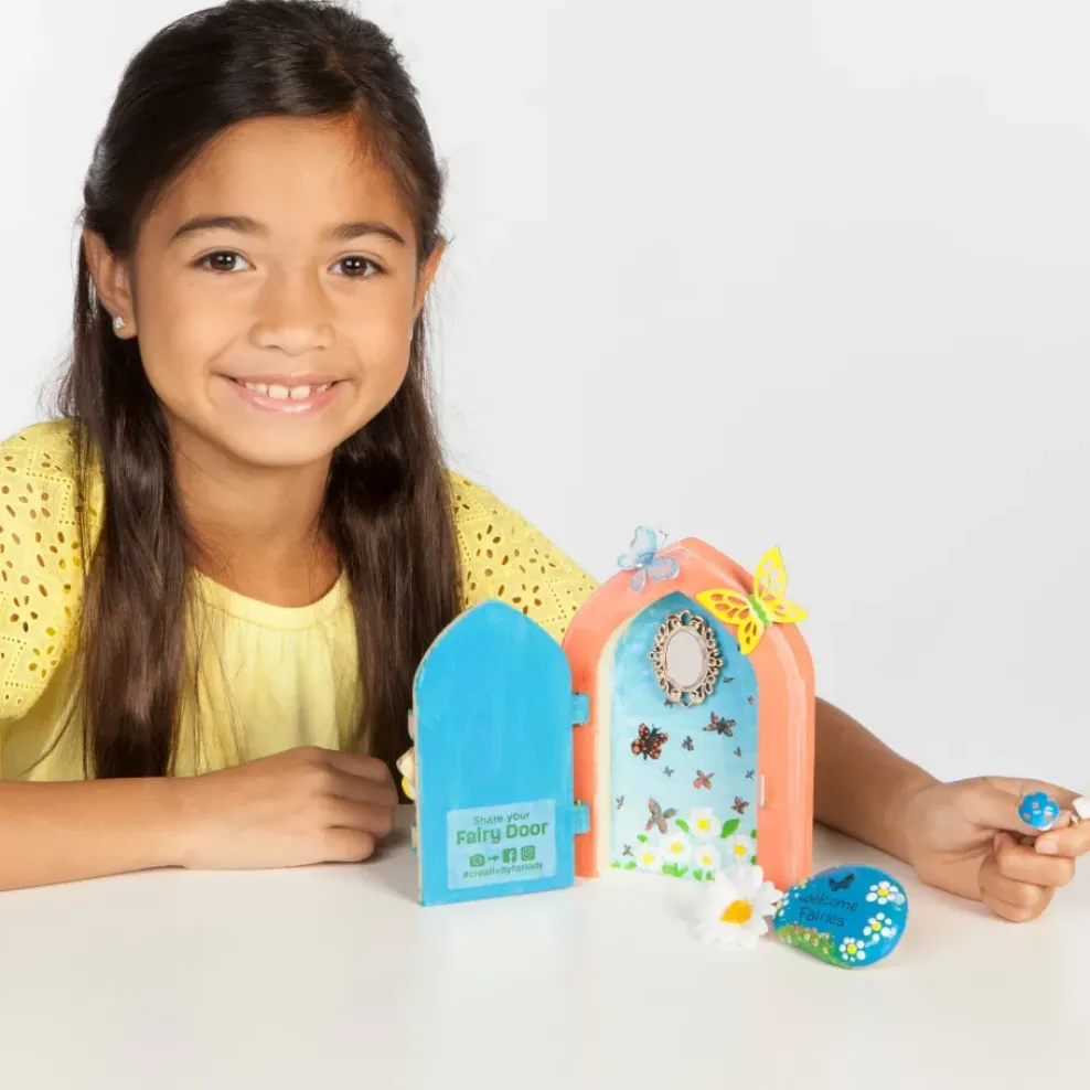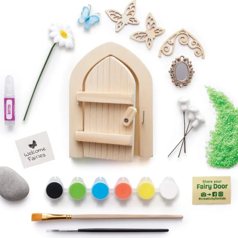 Fairy craft comes with everything you need to create a butterfly fairy door! Includes wooden fairy door with hanging hook (4.3”w x 6”h x 1.18”d), 6 Weather resistant paints, medium & fine tip paint brushes, wooden accents, adhesive-backed plastic mirror, tulle butterfly, foam mushrooms, faux flower, fairy rock, fairy rock transfer, gravel, waterproof glue, tracking sticker and instructions