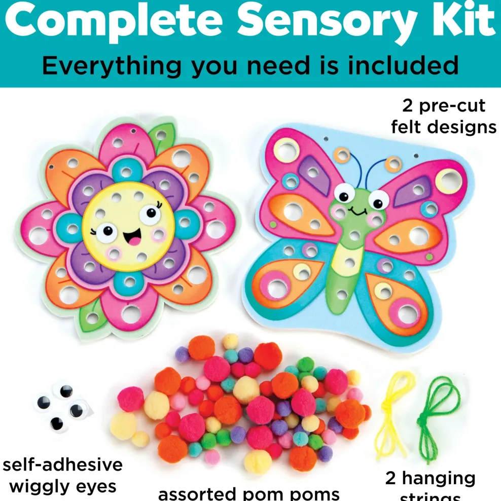 Preschool age kids will have fun discovering colors and sizes as they witness butterfly and flower friends come to life through this engaging art activity. Tailored for toddlers, interactive “pop & push” pom pom kit requires no glue, ensuring less mess, more fun and allowing for repeated use! 2 illustrated, soft foam felt boards securely hold brightly colored pom poms in place.