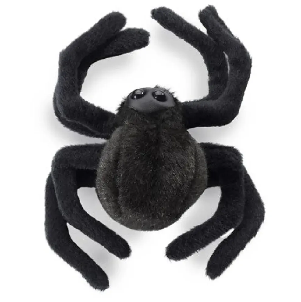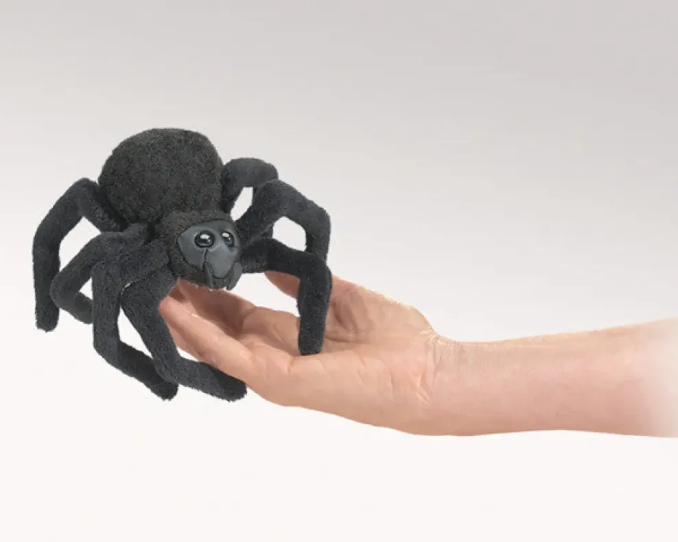 Arachnophobes won’t mind the whimsical Mini Spider finger puppet. Featured in all black this not so scary creature has gangly long legs, a bulbous abdomen, and fangs on a leatherette face with big beady eyes.