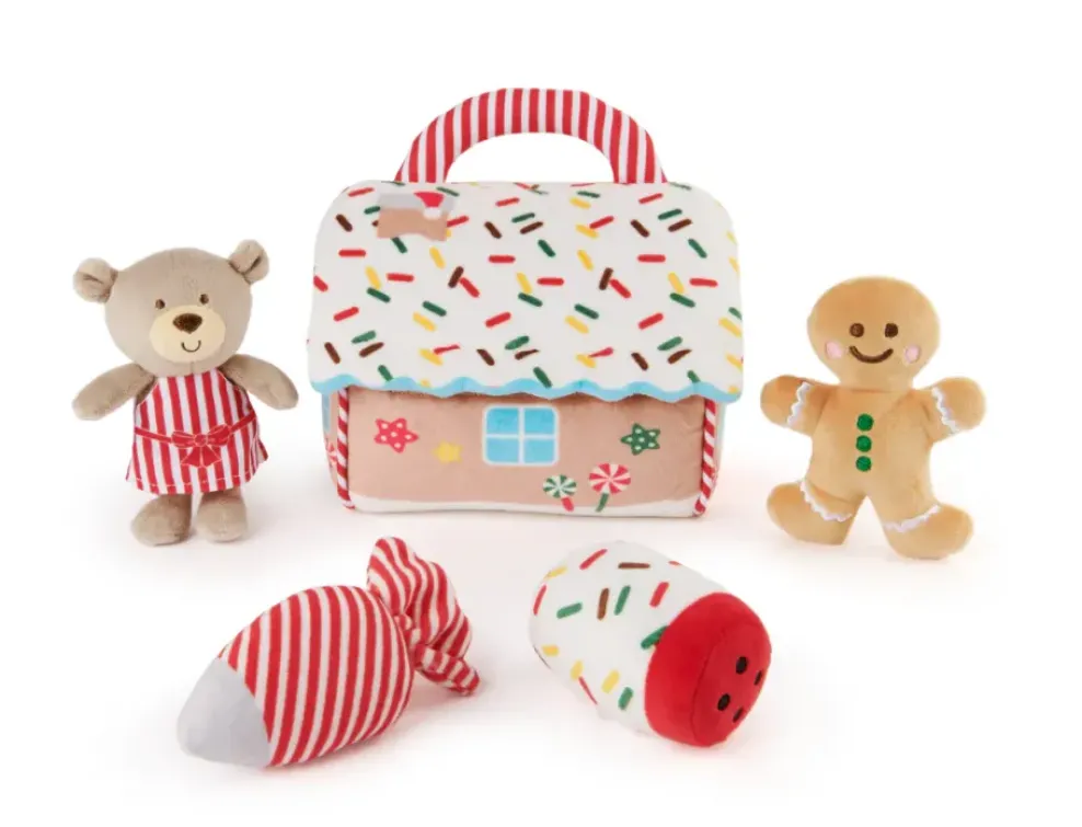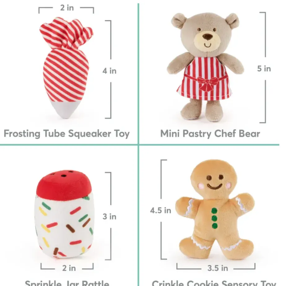 The My First Gingerbread House playset is a cuddly, modern way to introduce little ones to winter traditions while they play! This adorable five-piece playset contains different dessert-themed sensory-stimulating plush toys, all designed with special features for extra sweet and wintry fun. The soft miniature plush pastry bear wears a red-and-white striped apron and chef’s hat; the soft gingerbread sensory plush delivers a satisfying crinkle sensation when squeezed, the striped frosting piping tube squeaks, and the sprinkle-speckled jar rattles softly to keep your little one shaking and moving.