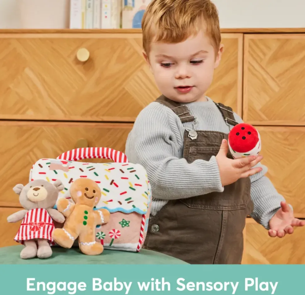 The gingerbread house itself is decorated with colorful sprinkles, candies, and Christmas decorations, and features a soft handle for little hands to carry and easily take anywhere playtime goes. Even better, the house’s icing roof opens up and features a touch-and-close fastener, keeping all sensory toys stored neatly when not in use. This set is a perfect way to encourage baby to touch, discover, and engage in imaginative play… even on the go!