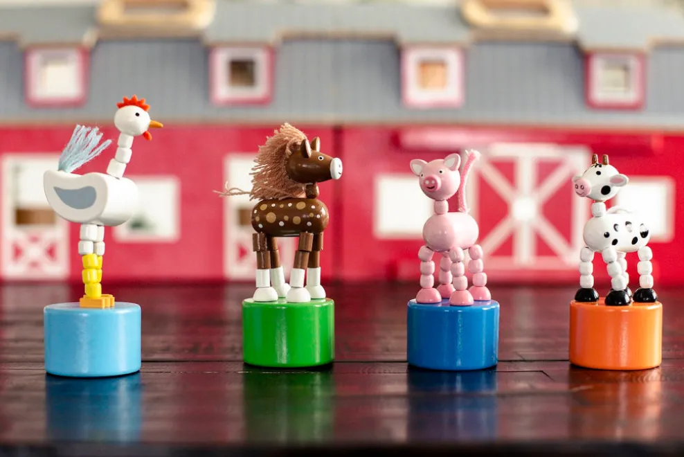 It’s busy on the farm with all our farm friends! Push the button and watch them droop – and let go them to pop back into action. Randomly selected from: horse, cow, pig and chicken.