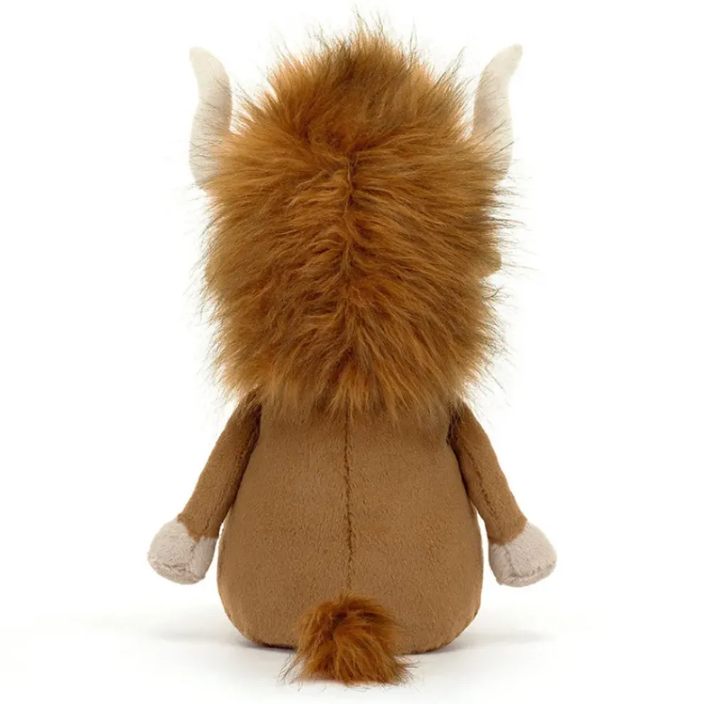 Ramone Bull has a wild mane of silky fur in ginger and charcoal. This sturdy bull has beige suedette horns, a cinnamon tum and a tassel tail. Ramone’s got a huge stitched nougat nose and matching cloven hooves.