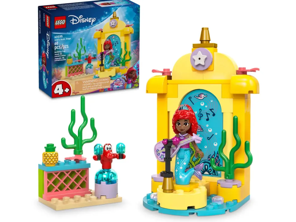 - Construction playset – This buildable set has a music stage inspired by the Disney Junior TV show Ariel, a LEGO® ǀ Disney Ariel mini-doll figure and a LEGO ǀ Disney Sebastian animal figure