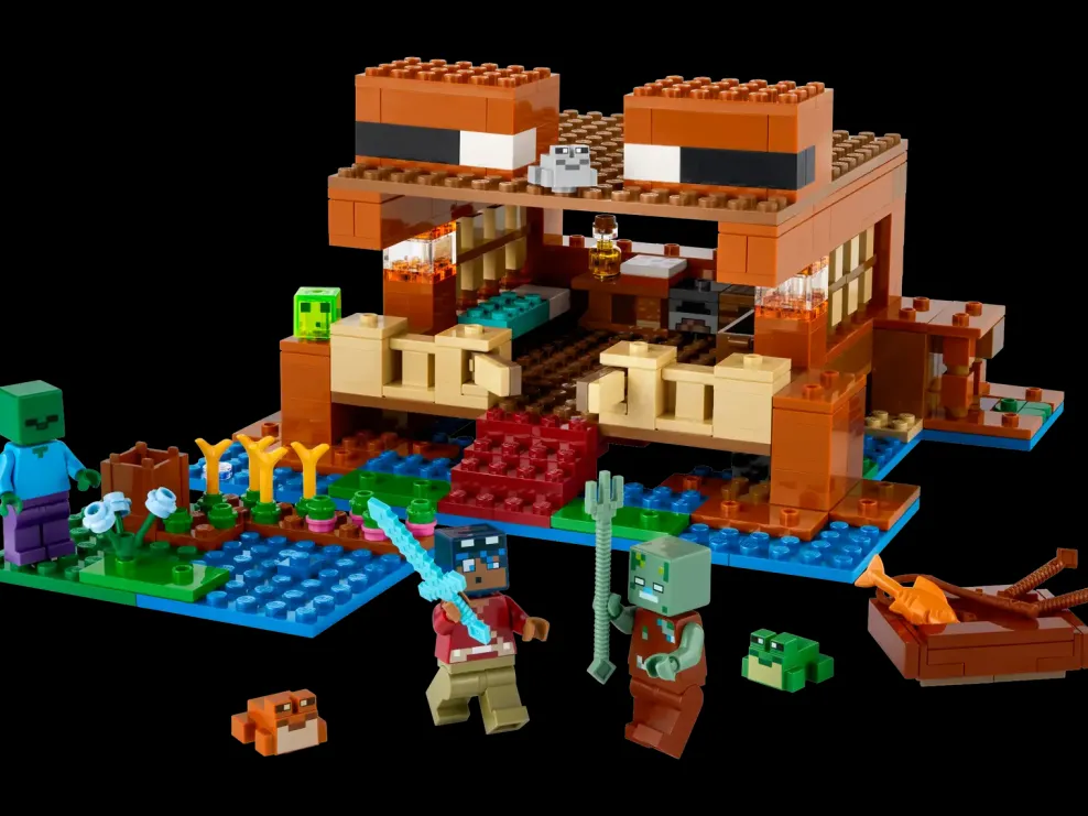 - Minecraft® figures set – This authentic playset includes a buildable house with Minecraft characters: the Swamp Explorer, a zombie, a drowned, a slime and 3 Frogs
