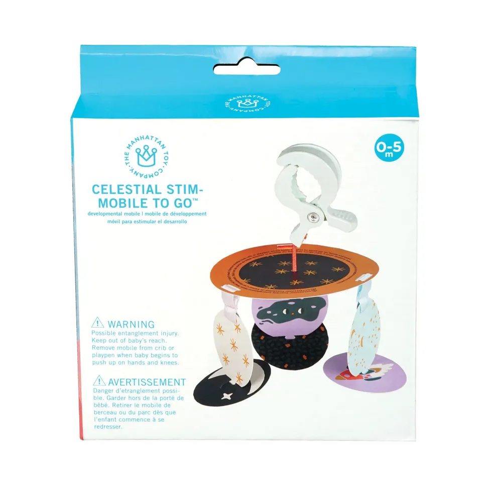 This unique travel mobile is a celestial take on our award-winning Wimmer-Ferguson Infant Stim-Mobile To Go. Space-themed graphics cover this compact travel mobile that easily attaches to strollers, carriers, and more. Features three reversible cards that promote visual development.