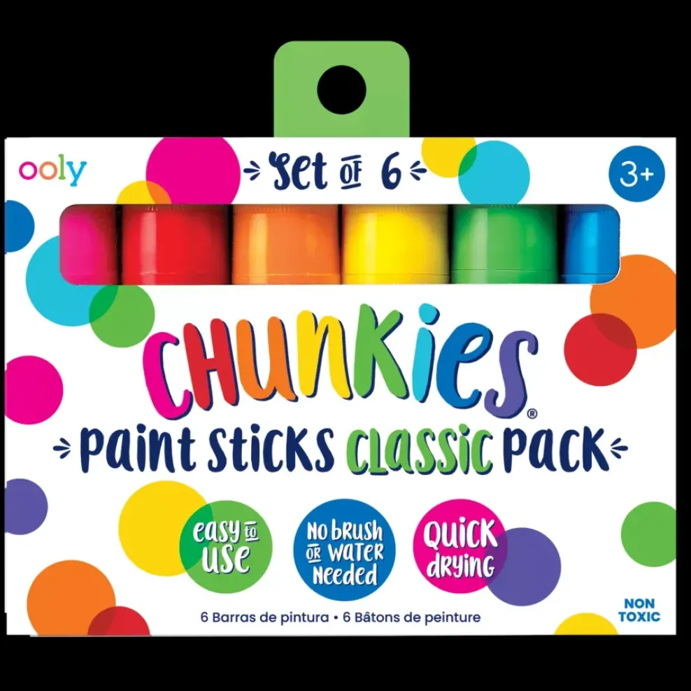A starter set of Chunkies Paint Sticks in a travel-friendly pack of 6! These paint sticks are easy to hold and come in 6 classic and quick drying colors. You can twist up barrels for long-lasting, mess-free fun that kids and adults alike will love.