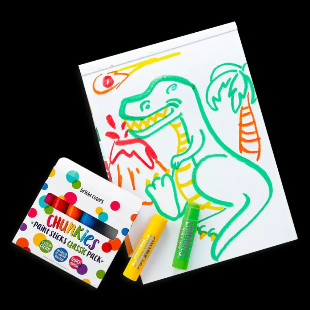 When you want to paint colorful pictures but want to leave the mess behind then it’s time to reach for Chunkies Paint Sticks. Chunkies are super easy to use, clean and portable because they’re like painting with a crayon. Just uncap, twist and start painting. Chunkies comes in a set of 6 different colored paint sticks each in a thick barreled casing so they’re easy for little hands to hold. The paint colors are quick drying and won’t smudge, but it’s easy to mix colors to make even more colors. It’s magic! Care and use recommendations: Keep capped when not in use, to help prevent drying. Cover and protect your workspace. This product may stain some surfaces.