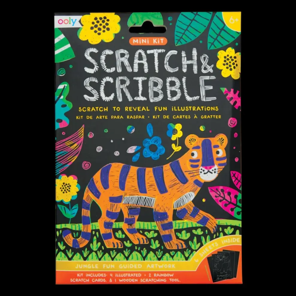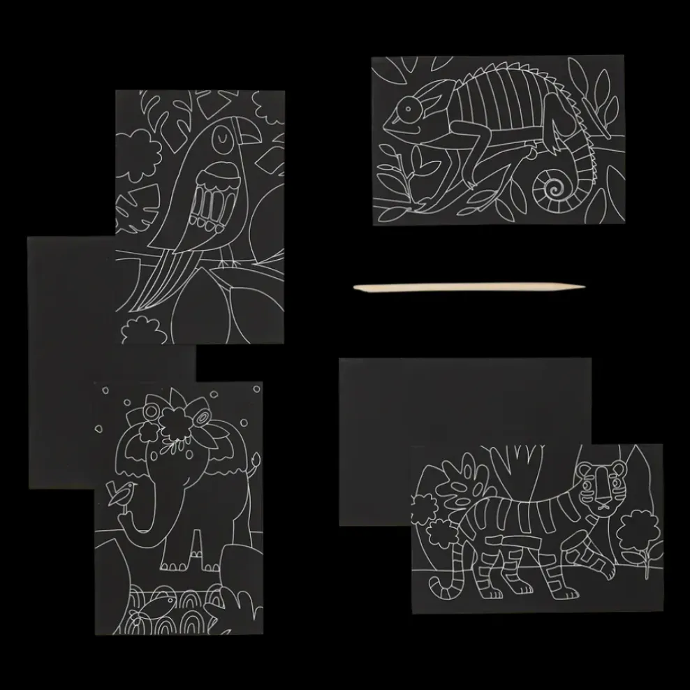 You never know what you might find in the jungle! A parrot? A tiger? A different cutie creature? Discover it all for yourself with this mini scratch art kit. Scribble and scratch the illustration using the wooden stylus—and a whole jungle-themed world will come to colorful life! Four different illustrations are included in this scratch art kit, as well as two blank scratch cards to create your very own work of art. This scratch art set is a great gift for busy hands and creative spirits!