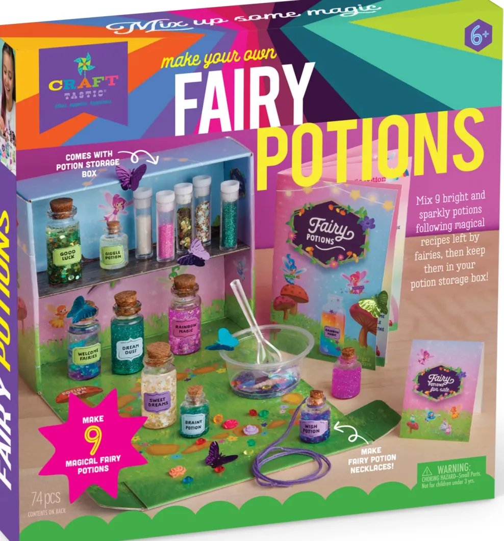 • Includes 1 potion cabinet box, 1 instruction book, 9 plastic vials with 9 corks, 1 plastic spoon, 2 plastic cups, 1 plastic funnel, 3 yds (2.7 m) cotton thread, 4 metal rings, 1 sticker sheet, 6 vials of glitter totalling 24 g (.84 oz), 3 g (.1 oz) iridescent confetti glitter, 1 g (.03 oz) metallic foil confetti, 3 plastic unicorn horns, 3 plastic flowers, 30 plastic gems