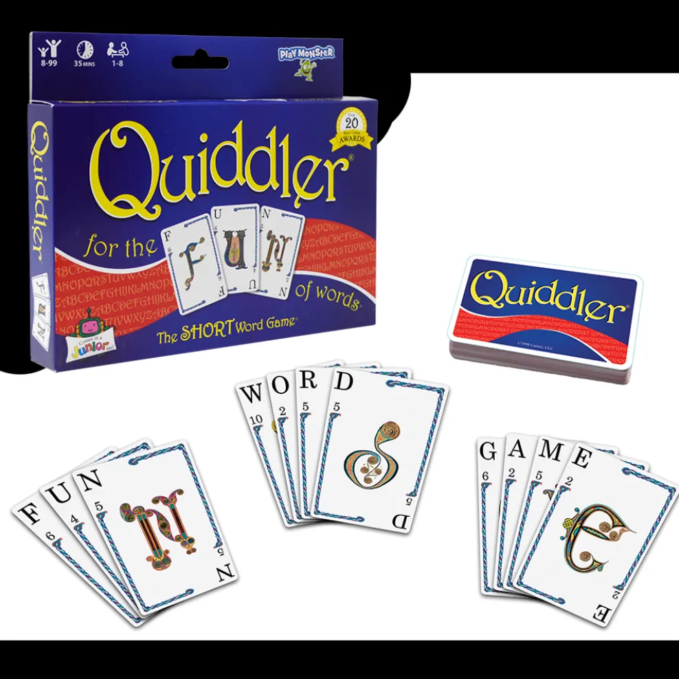 Quiddler is easy to learn and fun for everyone! Because it’s The SHORT Word Game®, it attracts non-word-game players as well as people who love word games! The goal is to arrange all the cards in your hand into one or more words. The number of cards dealt increases each round – starting with three cards and ending with 10 cards. High score wins, so use your high point letters and Quiddler’s unique double letter cards — but don’t get caught with them in your hand! Aim for the bonuses—one for the most words and one for the longest word! It’s great for families and parties! Plus, it sharpens skills like spelling, vocabulary and critical thinking, so teachers love it, too! For 1 to 8 players.
