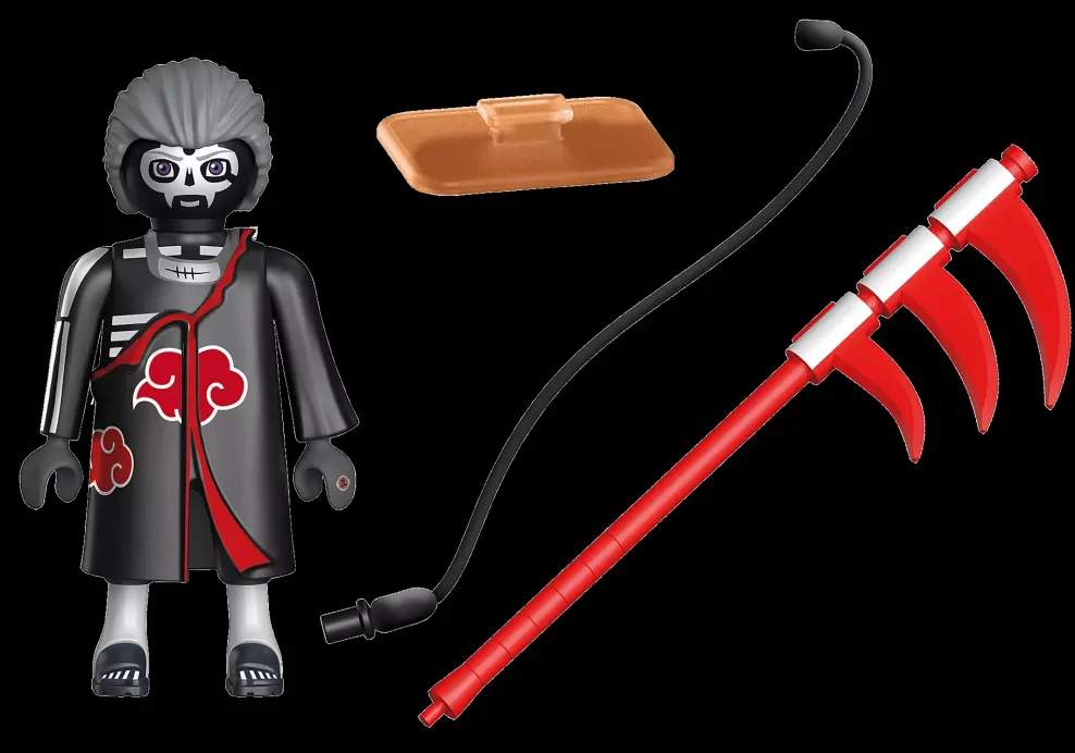 Hidan is a member of Akatsuki and a fanatical follower of Jashinism. Thanks to his religion, he is immortal and able to curse his opponents with a ritual. While performing his ritual, his skin turns black and shows white lines reminiscent of a skeleton. Hidan has no respect for anything or anyone. The PLAYMOBIL playset includes Hidan wearing a black Akatsuki cloak with a fearsome black and white face and a three-bladed scythe. For two decades, the anime Naruto Shippuden has thrilled fans all over the world. Just in time for the 20th anniversary, the first unique characters from the popular series are now appearing in PLAYMOBIL format. With great details and authentic extras, the precisely designed figures invite to re-enact legendary scenes and invent new stories. Creative fun for anime fans of all ages.