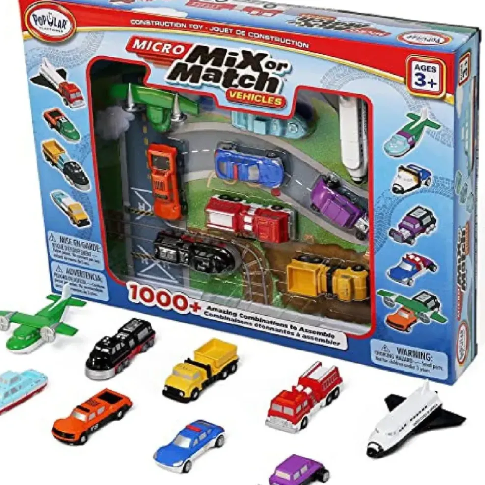 Even the smallest of toys can fuel one’s imagination. This 27 piece set of MICRO Mix or Match Vehicles allows you to build nine familiar vehicles, or to mix up the pieces and build nine vehicles you’ll never see on a road! Each pocket-sized 3-piece vehicle is 2.5 to 3.5 inches long and together can be combined 1000’s of different ways! Ever see a vehicle that can hall dirt to the moon and return home for a safe water landing? If you can think it, you can build it with MICRO Mix or Match Vehicles!