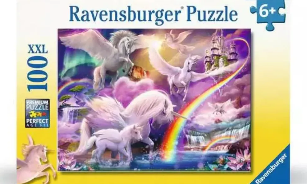 Imagine a land where the world of winged horses and unicorns blends into one. Both are mythical creatures and this fabulous illustration brings them together in a realm of towering mountains, waterfalls, and magical castles. The puzzle shows 4 magical unicorns “”on the wing””, whilst a caring Mum takes her foal through the rich blue waters. This puzzle is a fun way to spark interesting conversations, and a wonderful way for children to share time with parents, grandparents, siblings and friends. Our 100 piece kids puzzles with XXL large pieces are crafted with premium quality and measure 49 x 36cm when complete. Great puzzles for Children 6 years old and up.