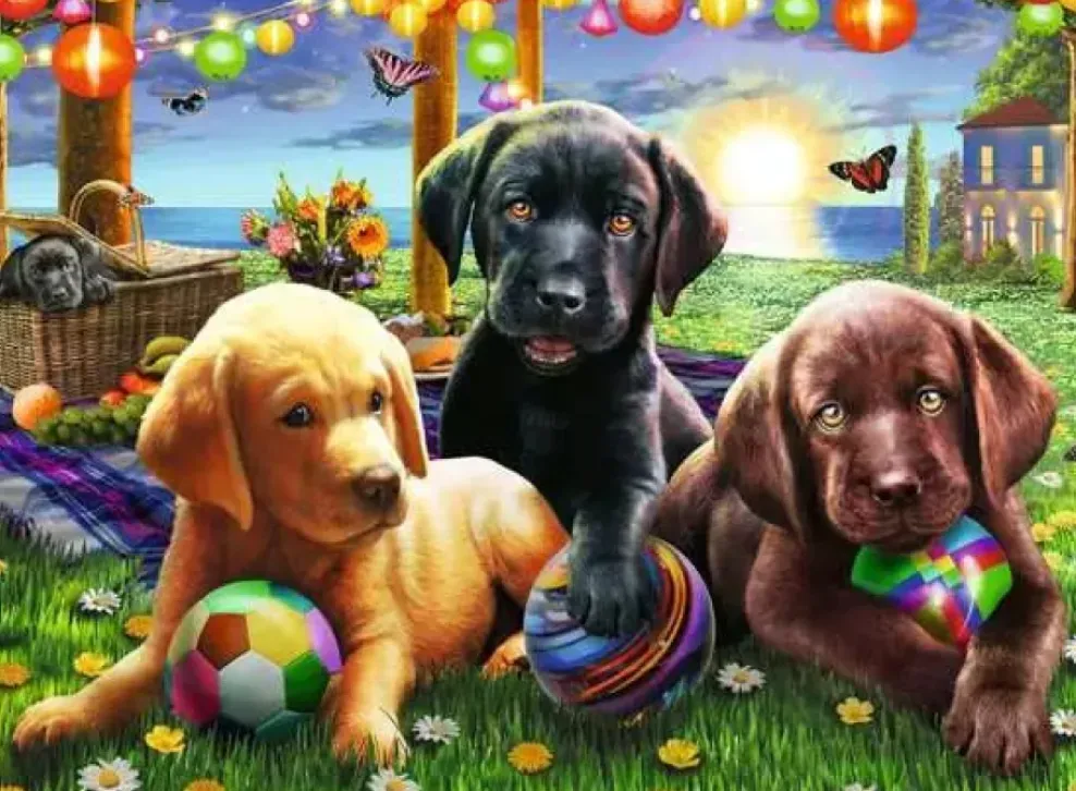 It’s been a busy day for these three adorable Labrador pups, and now they need to take a little rest from the play and excitement. Is their friend going to have a snooze in the picnic basket – or is he just going to eat the rest of the picnic? This early evening scene is aglow with color as bright-toned lanterns hang above a flower-filled meadow with a deep blue sea and turquoise sky beyond. A fun, colorful and great family-friendly pastime for ages 6+.