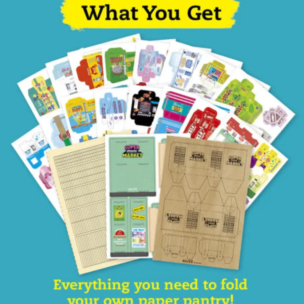 A supermarket that fits in the palm on your hand! (Well, almost.) Punch out the pages in this book to make an assortment of funny groceries, from cereal to cases of soda, and much more! Every package is decorated with detailed and whimsical branding full of klutzy puns and spoofs. Create 100 unique packages and then display them on the store shelves. This wire-o book contains, 12 pages of instructions, 16 sheets of package punch outs, 1 sheet of brown craft paper punch outs for grocery bags, 2 sheets of cardboard punch-outs for package filler, 1 sheet of clear double sided tape, 1 chipboard sheet to make the display shelf.