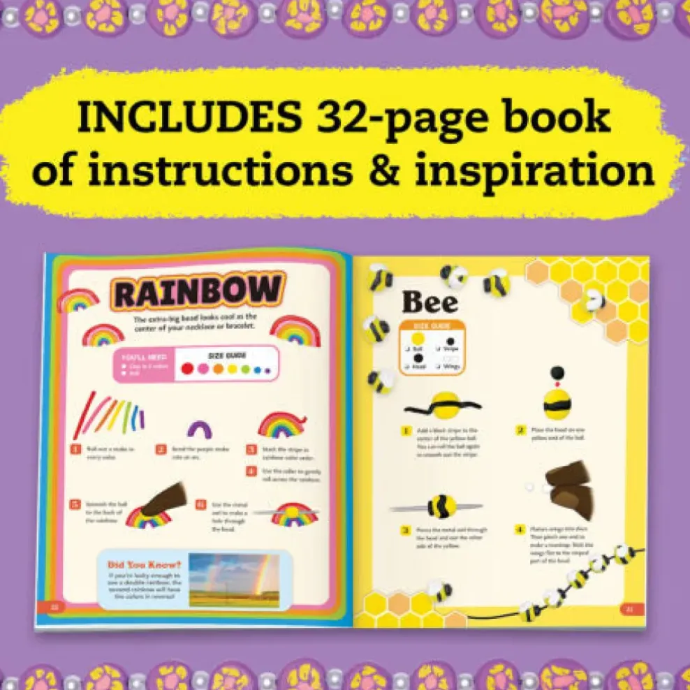 Using nine different colors of polymer clay, learn techniques for making more than 15 different types of beads, such as letter beads, canes, millefiori, and more! Includes a special tool for easily making the holes of the beads, sculpting accessories, faux pearl spacer beads, and two colors of elastic cording to string your finished pieces. Step-by-step instructions give crafters confidence to express themselves with custom creations.