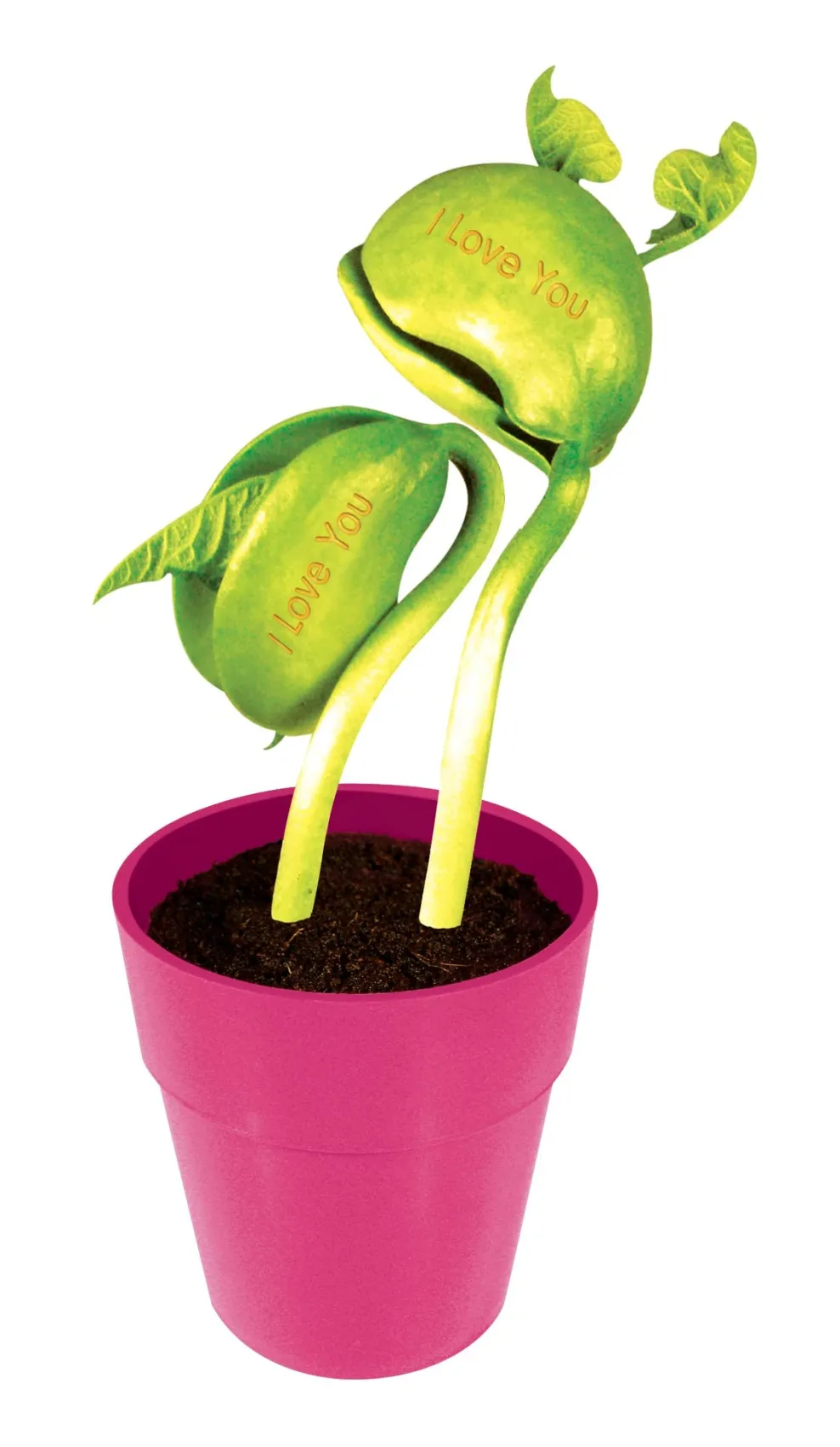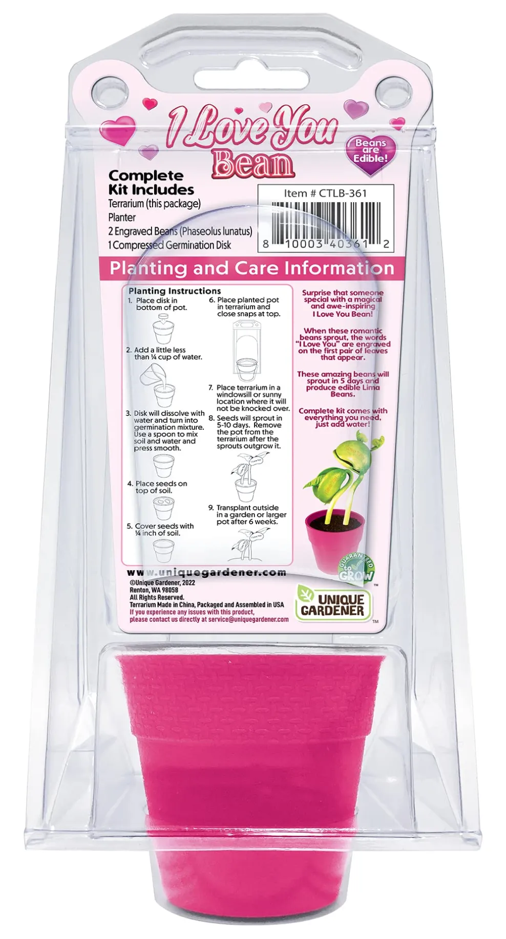 Surprise that someone special with a magical and awe-inspiring I Love You Bean! When these romantic beans sprout, the words “I Love You” are engraved on the first pair of leaves that appear. These amazing beans will sprout in 5 days and produce edible Lima Beans. Complete kit comes with everything you need, just add water!