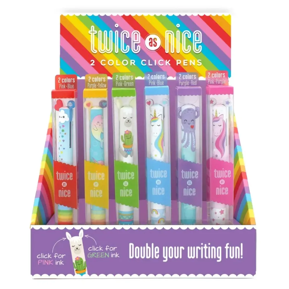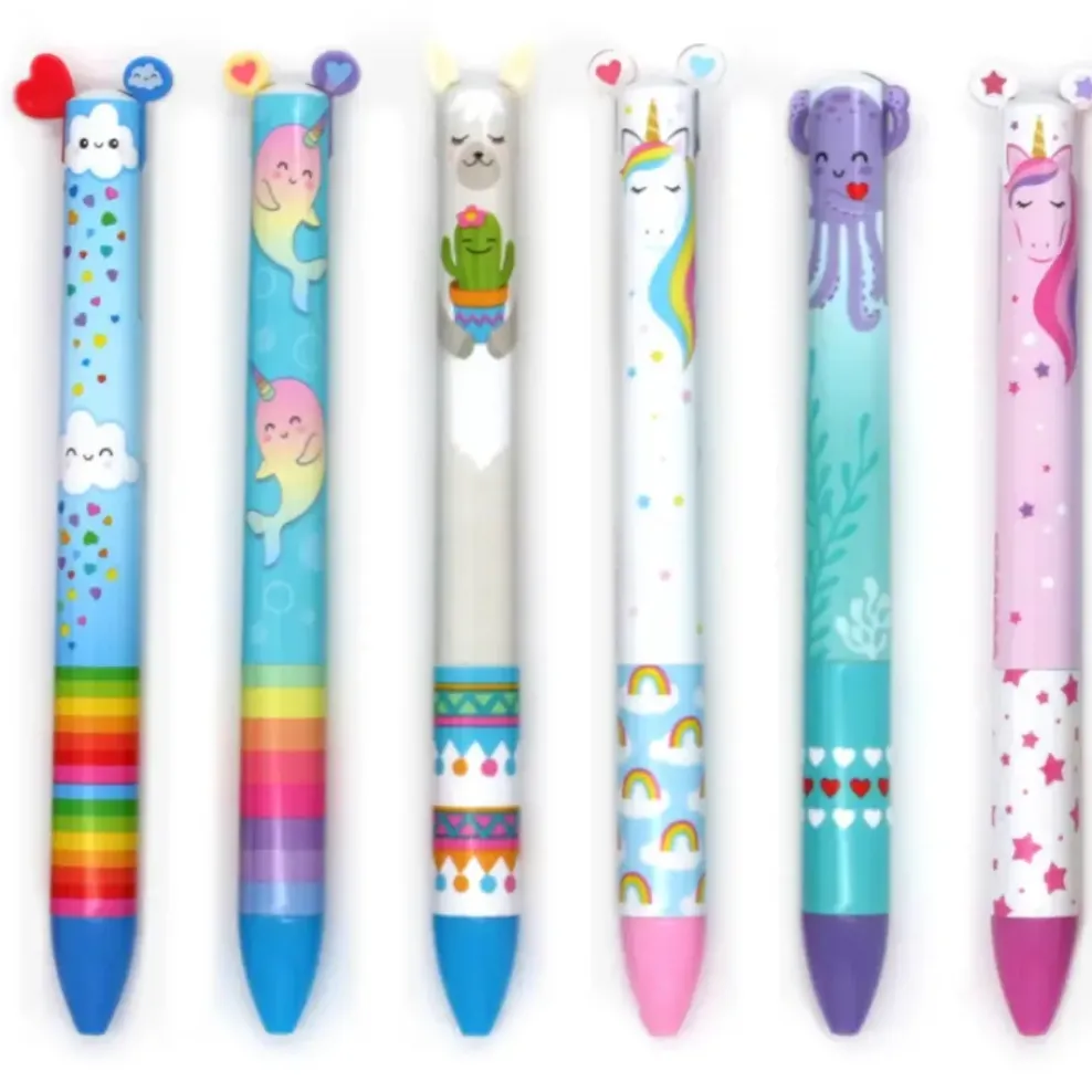 Rainbow 2 color click pens. Each pen writes in 2 different color inks, just click the ears and arms to release the colors. The perfect sweet little pick me up gift!
