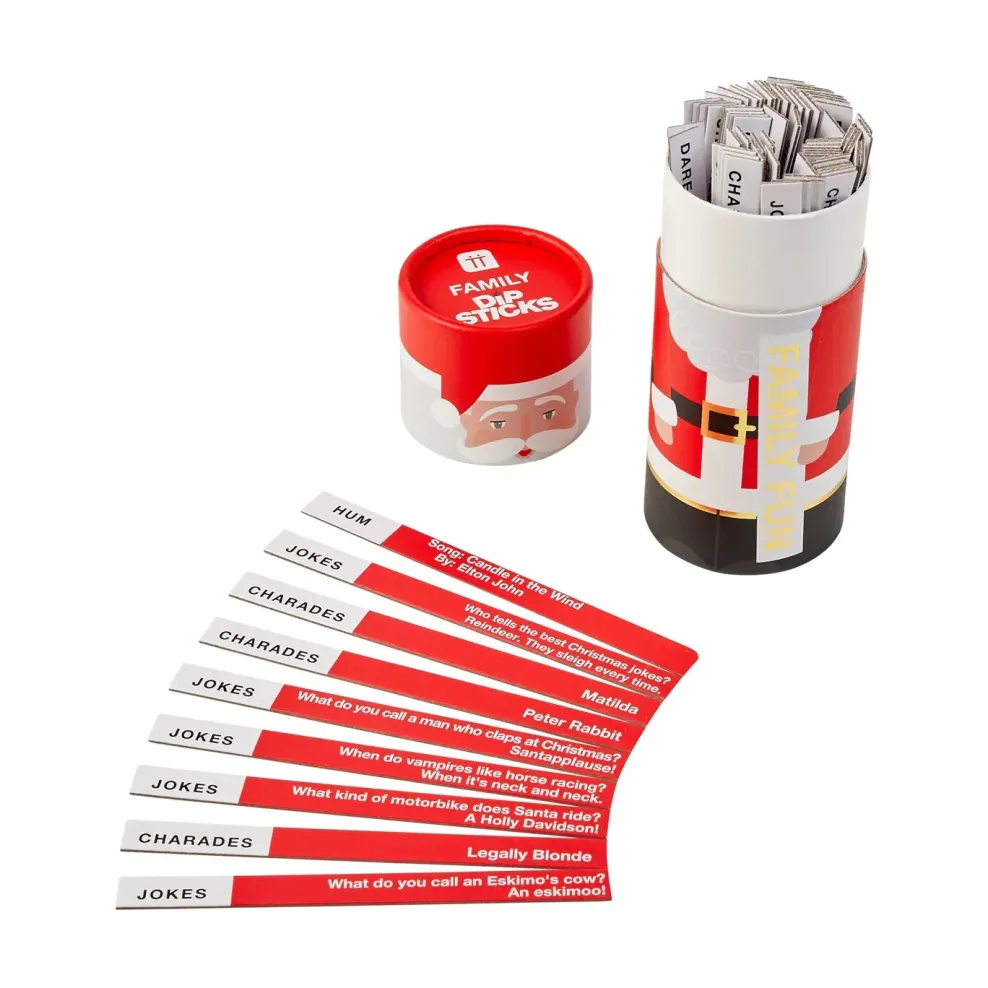Santa Dipstick Game POS by Talking Tables. Dip in, pick a stick and have some family festive fun! You could pick a stick featuring a Charade, Joke, Dare or Hum That Tune. This game is ideal for kids and adults when celebrating with the loved ones on Christmas Day or Boxing Day.