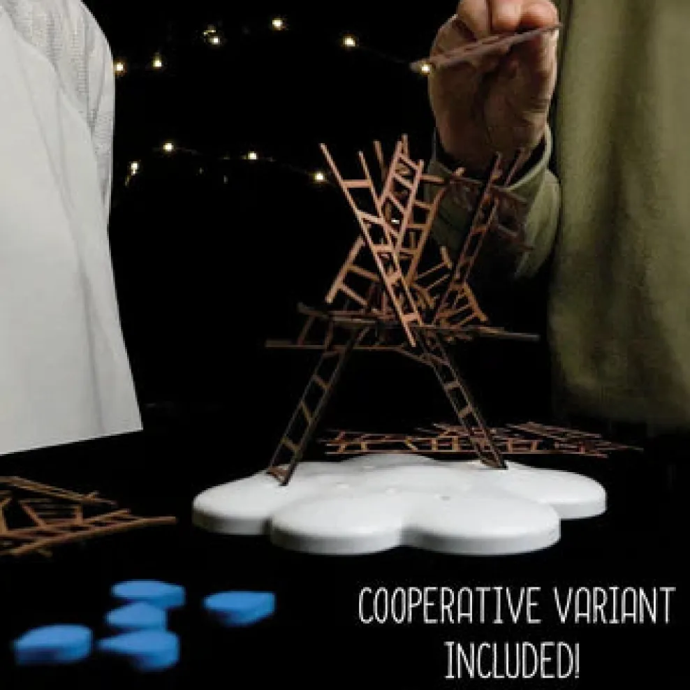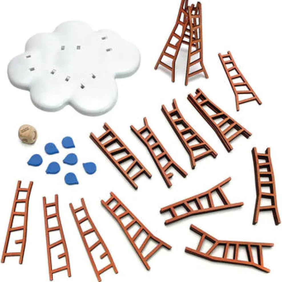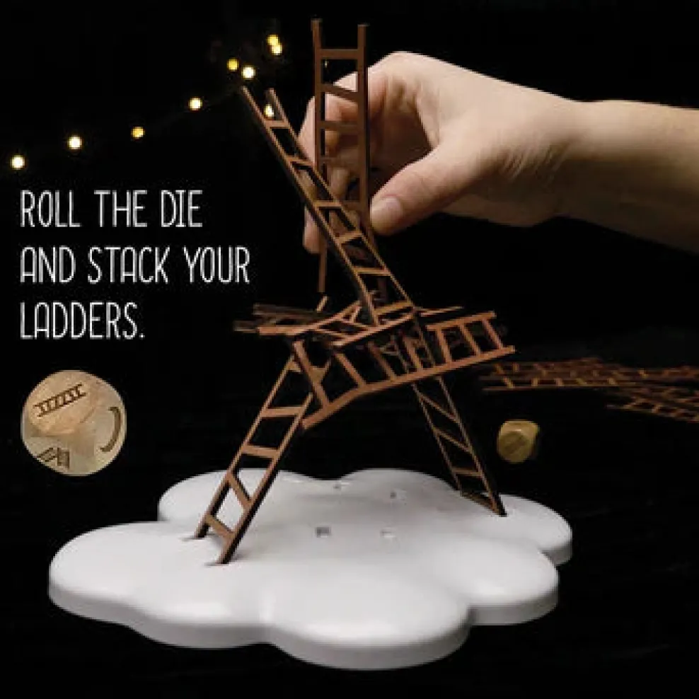 Players take turns rolling a die to determine how they must place their wooden ladder (must touch one other ladder, two other ladders, or be the highest point)