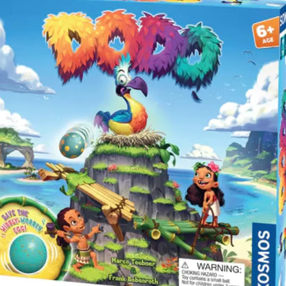 Oh, you silly bird! The Dodo has laid an egg, but … oh no! She accidentally pushed it out of her nest and it is tumbling toward the edge of the cliff. Can you save the egg before it falls into the sea? Work together to roll the die, collect materials, and build new bridges to help guide the Dodo’s wibbly-wobbly egg safely into the boat at the foot of the mountain. The innovative egg design allows it to advance down the slope at an unpredictable rate — you never know exactly how much time you’ll have! Will you save the egg and win the game?