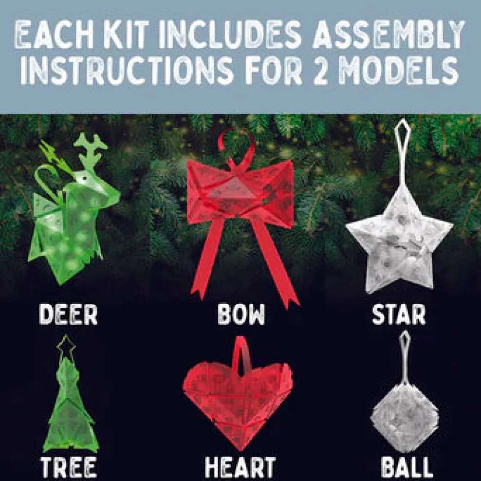 With 37 Creatto pieces and a string of 5 LED lights, you can build a white star or a ball ornament. The models have loops for use as ornaments. Battery-powered lights require 2 CR2032 batteries. Suitable for ages 8 and up.