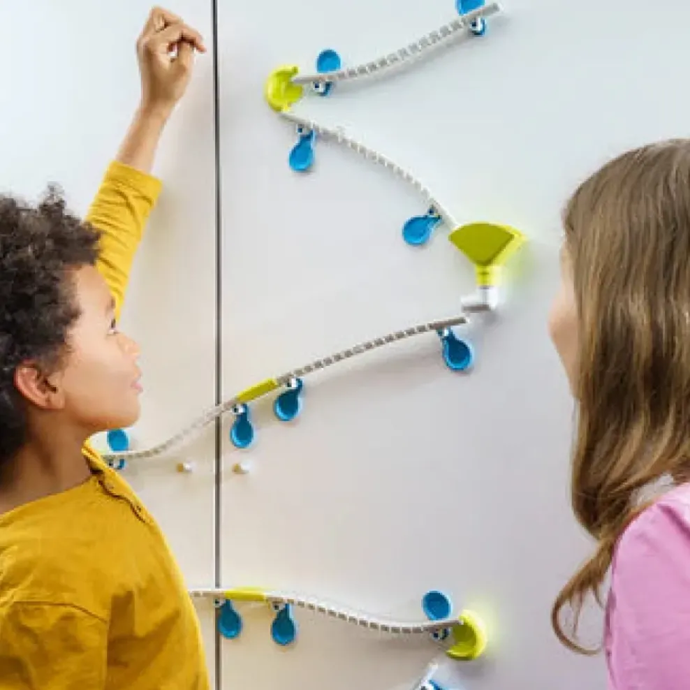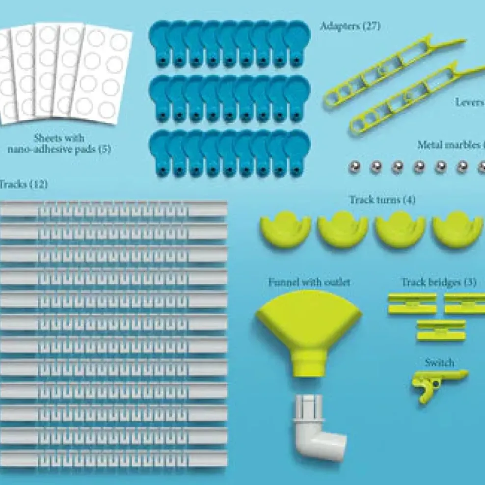 Gecko Run takes classic marble runs to the next level with new creative challenges and less restrictive building requirements. This innovative marble run uses a specially designed system of flexible tracks that does not require any support structures. Traditional marble runs require lots of pieces to create vertical height, but with Gecko Run, your doors, windows, cupboards, bookcases – virtually any smooth surface – become part of your track, allowing you to build higher with fewer pieces.