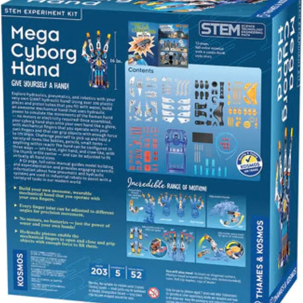 Once assembled, your cyborg hand slips onto your own hand like a glove, with mechanical fingers that you operate with your own fingers and that can grip objects with enough force to lift them. Challenge yourself to pick up and hold a variety of items like bottles, pencils, small items–anything with reach!