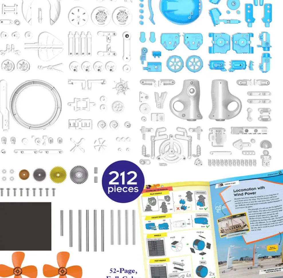 Build a big-wheel tricycle, quadruped, soaring machine, drilling monster, walking robot, and even a wind-powered yacht. To make them all go, the kit also includes the pieces to build a hand-powered wind generator. As you build and experiment, you will learn about how gears transmit power and torque. Also learn about wind as a power-generating technology — past, present, and future.