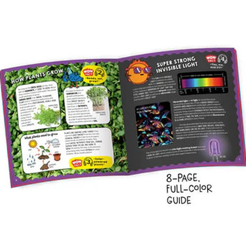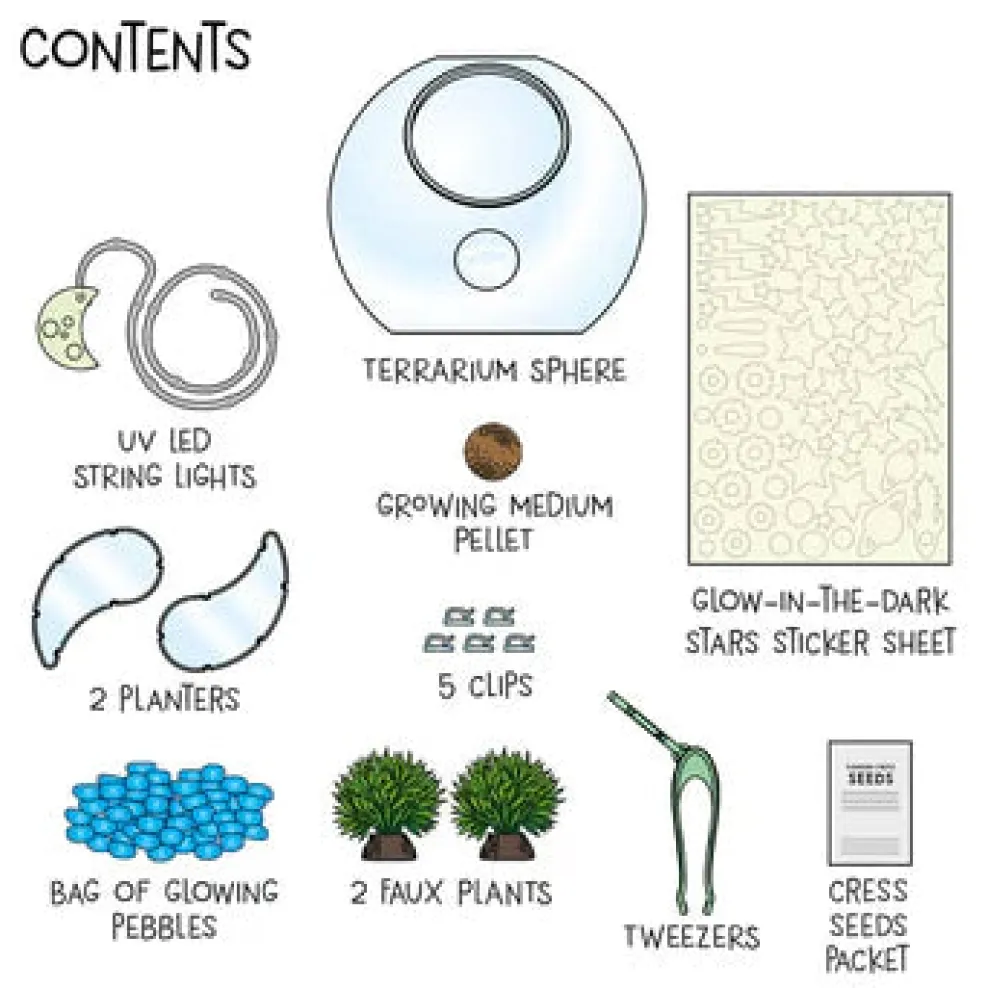 Get growing and glowing! Make your own awesome glowing terrarium with real plants. Use the included cress seeds and growing containers to create your own plant display and observe as the seeds germinate and grow. Decorate your terrarium with glowing materials like glow-in-the-dark stars and glowing plastic pebbles, as well as some faux plants. At night, your terrarium will light up a room when the included UV LED string lights (like blacklights) shine on the phosphorescent materials and make them glow.