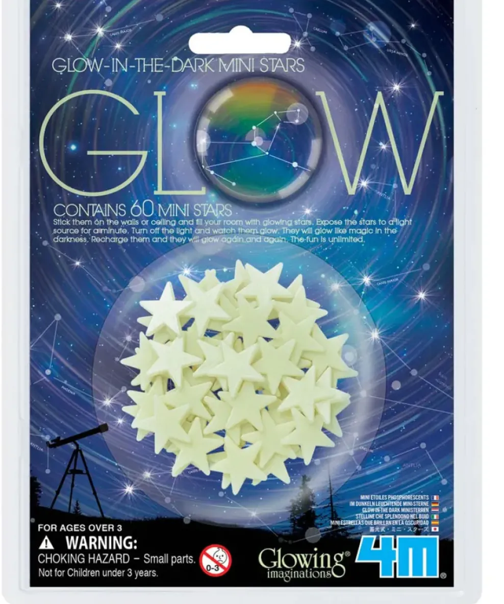 Easily stick these Glow-In-The-Dark Mini Stars to any wall or ceiling. Great for room decoration. Contains 60 mini stick-on stars.