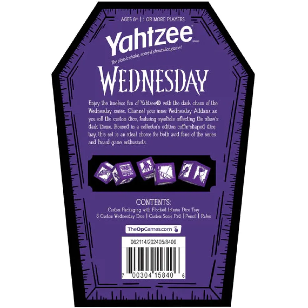 Enjoy the timeless fun of Yahtzee® with the dark charm of the Wednesday series. Channel your inner Wednesday Addams as you roll the custom dice, featuring symbols reflecting the show’s dark theme. Housed in a collector’s edition coffin-shaped dice cup, this set is an ideal choice for both avid fans of the series and board game enthusiasts.