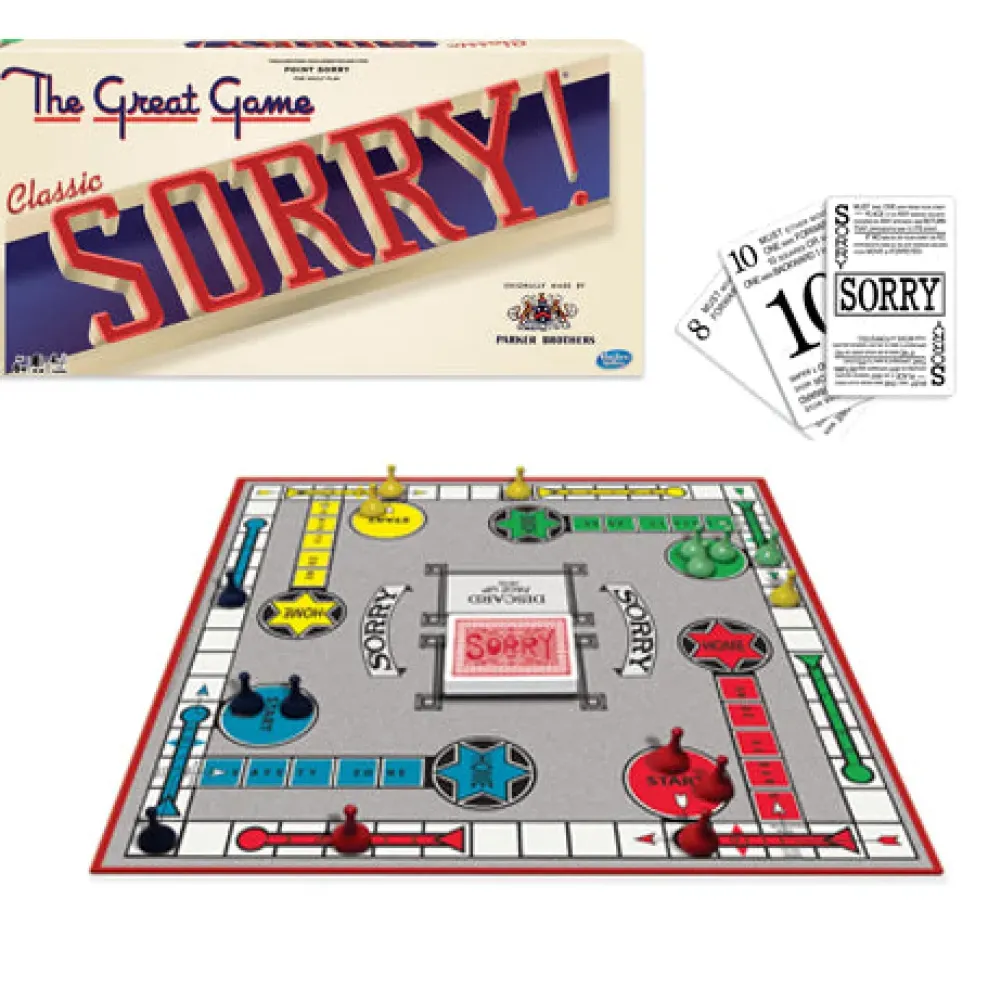 - Contents:Heavy-duty gameboard with original artwork, 16 iconic Sorry pawns, Deck of 44 cards with classic artwork and illustrated instructions.